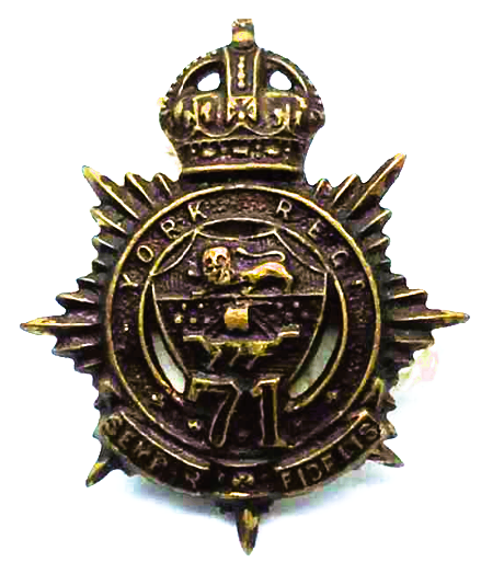 The York Regiment originated on 10 September 1869, in Fredericton, New Brunswick, as The York Provisional Volunteer Battalion.  It was redesignated on 12 November 1869, as the 71st York Volunteer Battalion. Redesignated on 8 May 1900, as the 71st York Regiment. Redesignated on 15 March 1920, as The York Regiment. Amalgamated on 15 December 1936, with The Carleton Light Infantry and Redesignated as The Carleton and York Regiment.