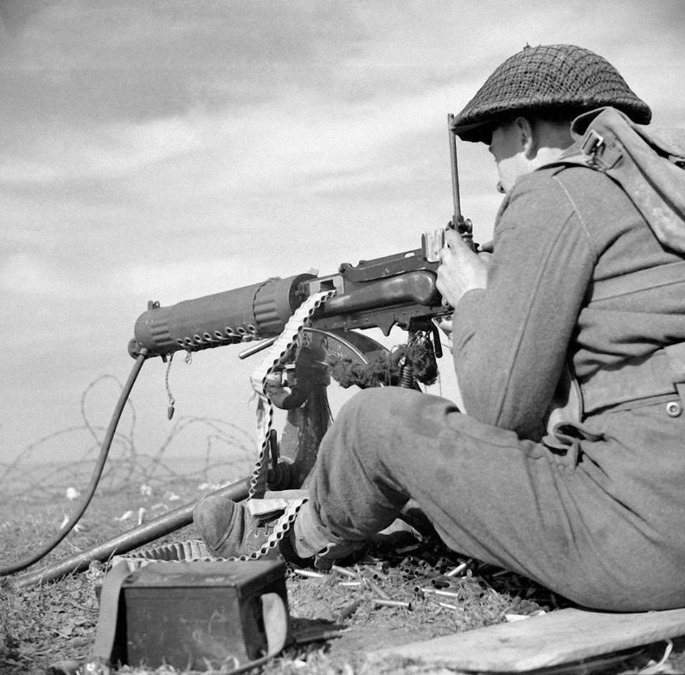 Vickers machine-gunner in action during the Second World War. / Le mitrailleur Vickers en action pendant la Seconde Guerre mondiale.