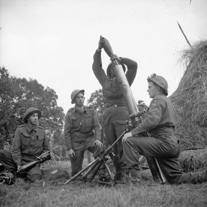 A 4.2-inch mortar crew in action in the Second World War. / Un équipage de mortier de 4,2 pouces en action pendant la Seconde Guerre mondiale.