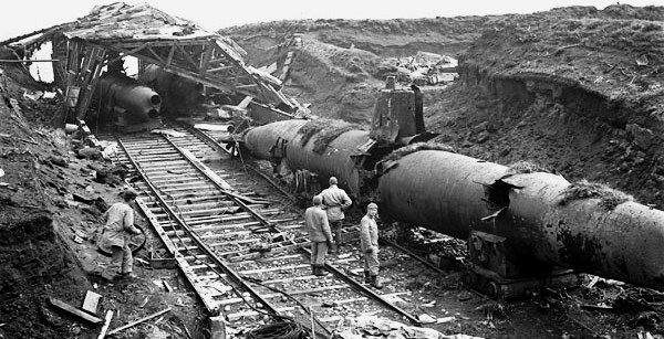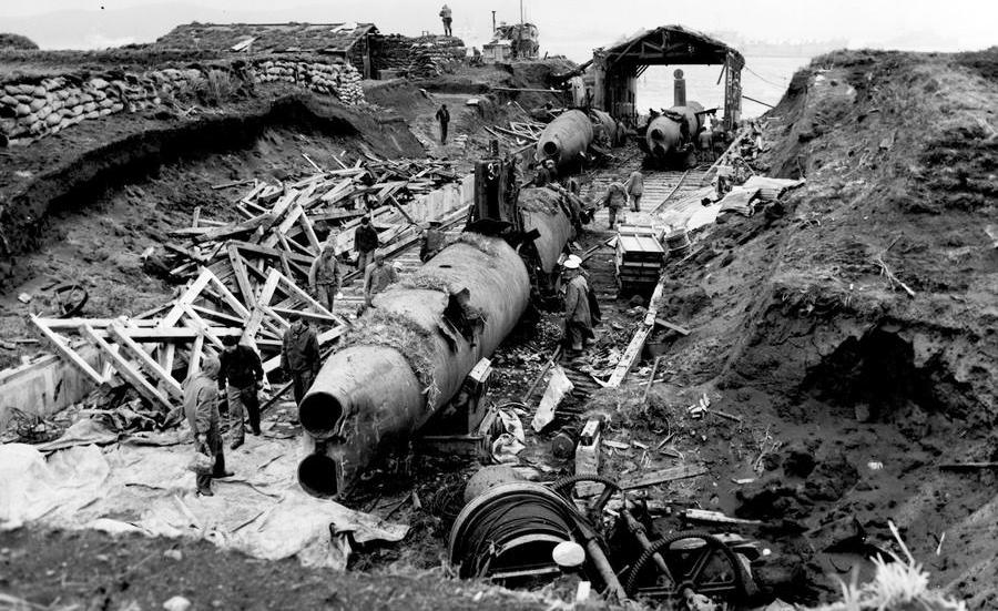 A heavily damaged midget submarine base constructed by occupying Japanese forces on Kiska Island, photo taken sometime in 1943, after Allied forces retook the island.