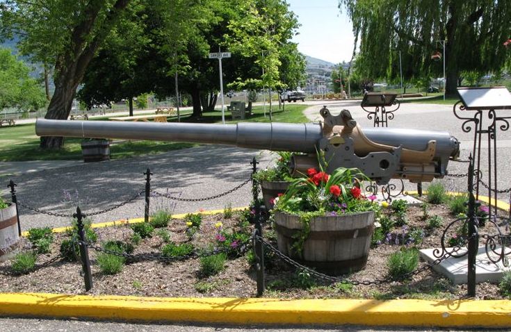 The Naval gun was collected and brought to Vernon in 1944 by Canadian Engineers. It was set up in front of their mess hall where it stood for a few years until being moved to its present display location in front of the headquarters of the Vernon Army Cadet Summer Camp. The gun serves as a memorial to the four Canadian fatalities from the Winnipeg Grenadiers, the Fusiliers de Mont-Royal and the Rocky Mountain Rangers.