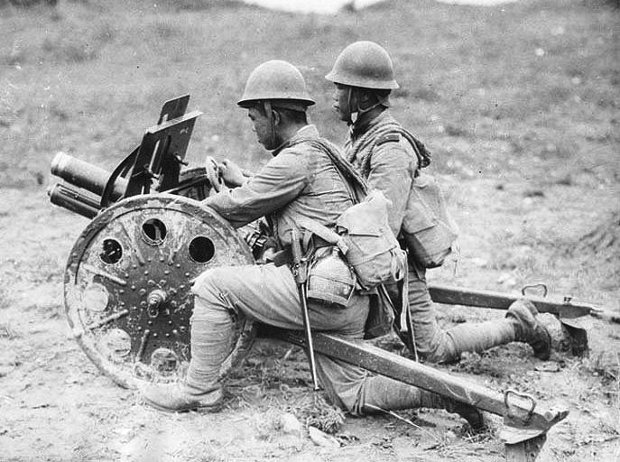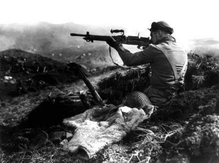 7.7-mm Nambu Type 99 Light Machine Gun held by a Canadian member of the joint American-Canadian landing force. He found this Japanese machine gun in a trench on Kiska Island, Alaska, on 16 August 1943. After the brutal fighting in the battle to retake Attu Island, U.S. and Canadian forces were prepared for even more of a fight on Kiska. Unknown to the Allies though, the Japanese had evacuated all their troops two weeks earlier. Although the invasion was unopposed, 32 soldiers were killed in friendly-fire incidents, four more by booby traps, and a further 191 were listed as Missing in Action. (US Library of Congress Photo)