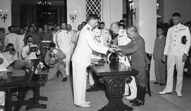 Major-General Okada handing over his sword during a ceremony marking the surrender of Japanese forces in Hong Kong, Government House, 16 Sep 1945.