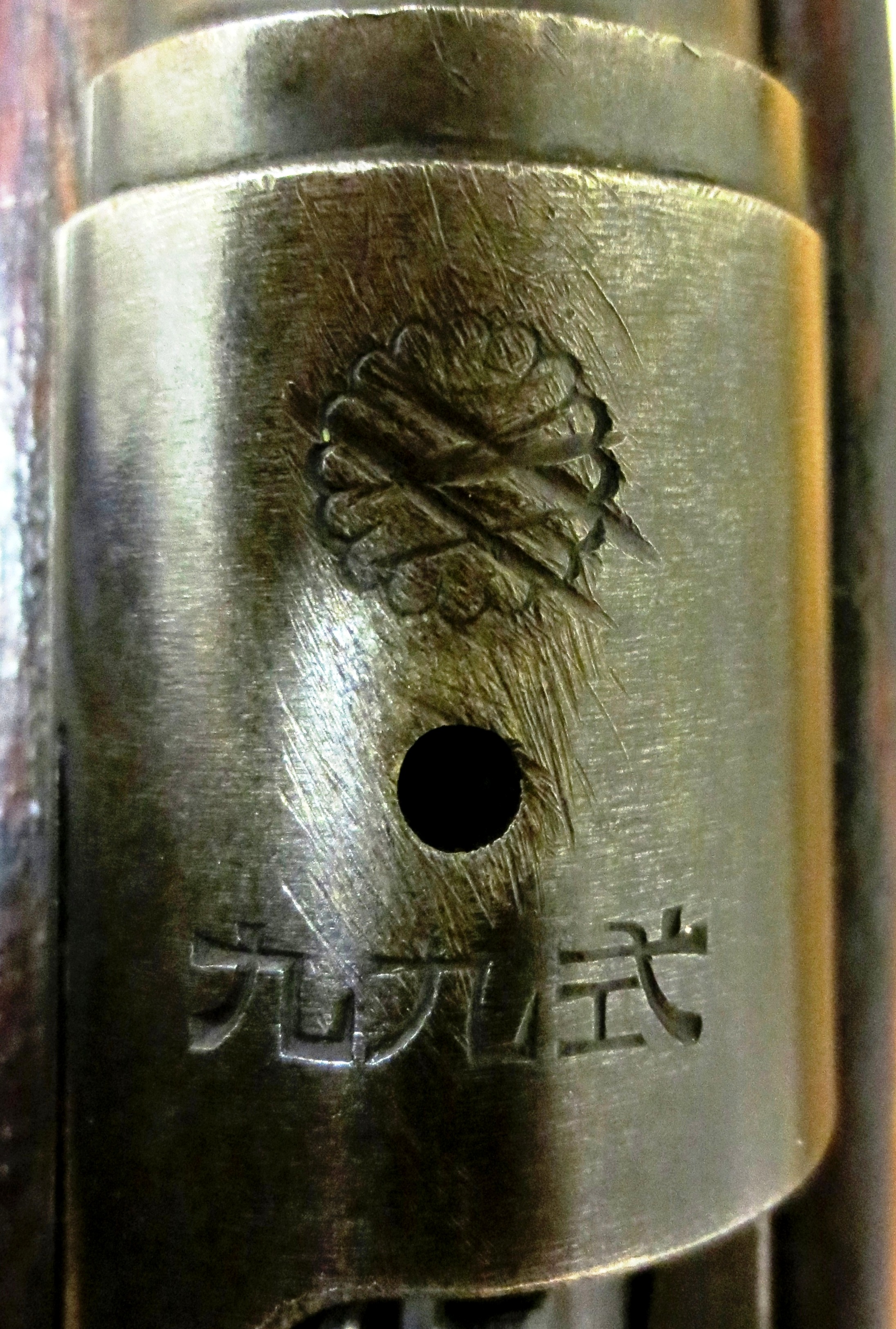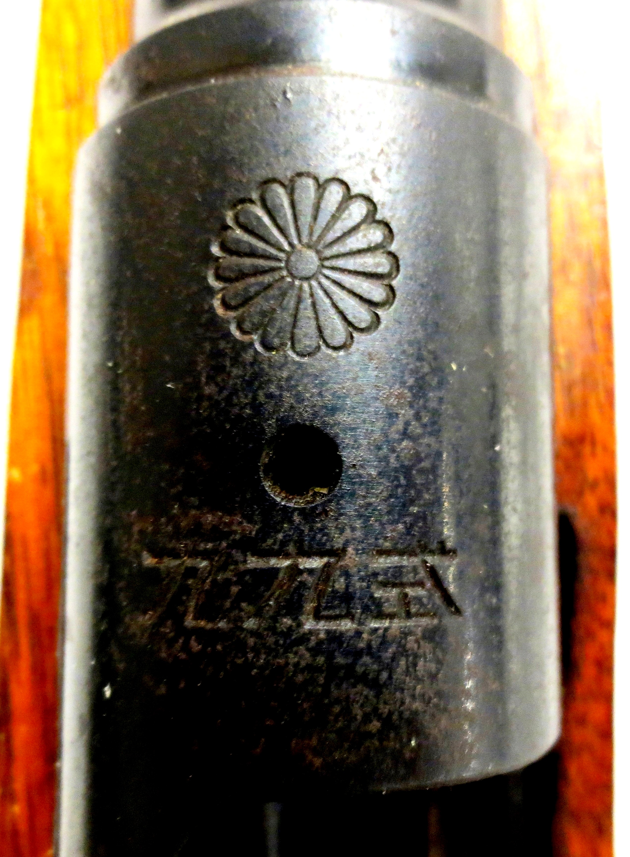 7.7-mm Ariska Type 99 bolt action rifle, with Imperial Chrysanthemum undamaged, and one partially defaced (often ground off the receiver to prevent embarrassment to the Emperor should the rifle pass into foreign hands). NBMHM Collection.