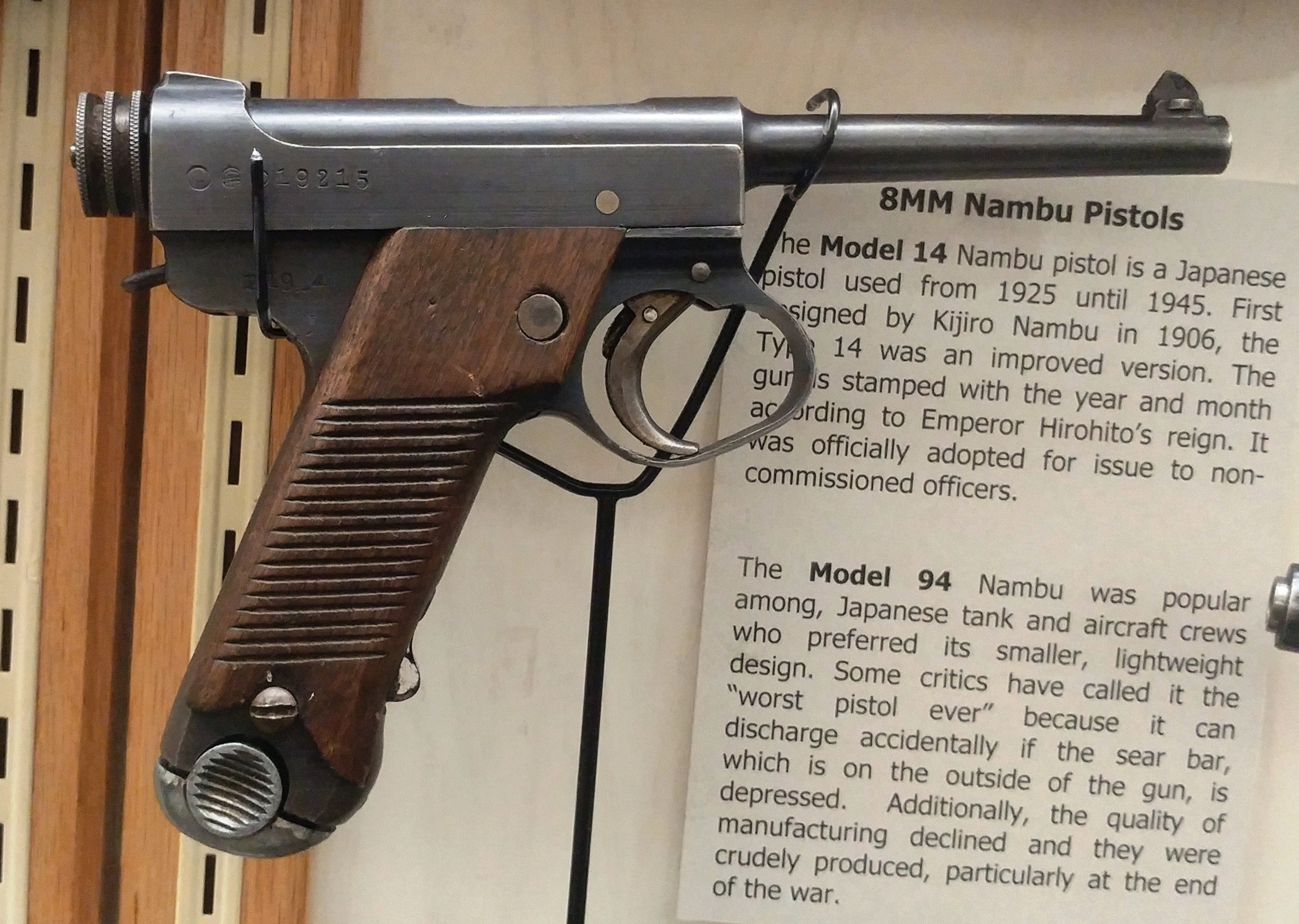 8-mm Nambu Taisho 14th Year Type 14 semi-automatic pistol wth large trigger guard. Canadian War Museum, Ottawa, Ontario.