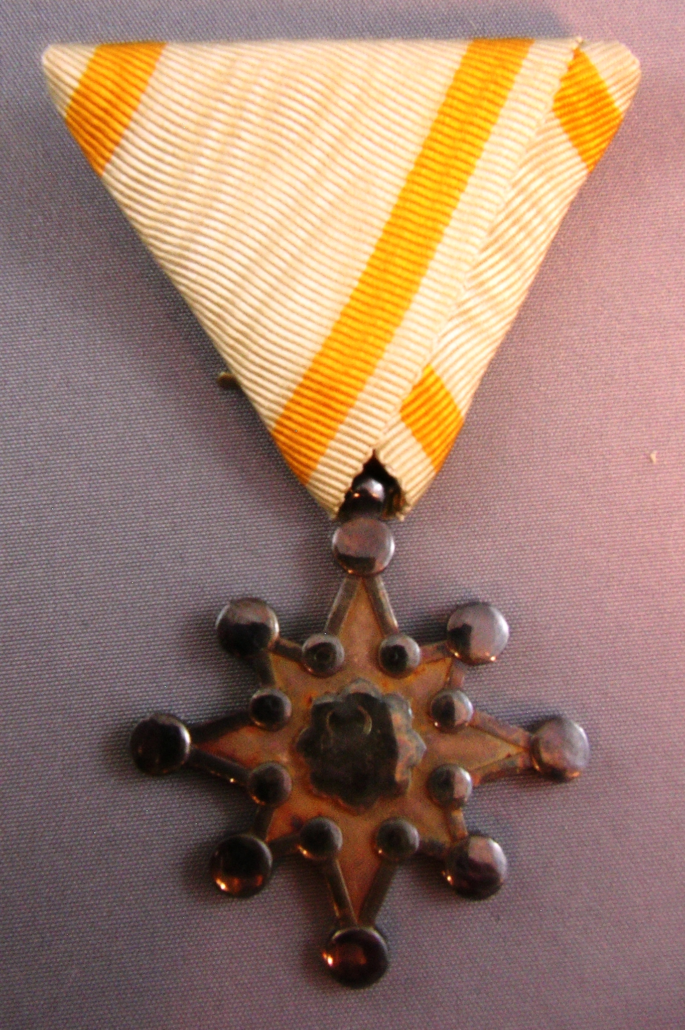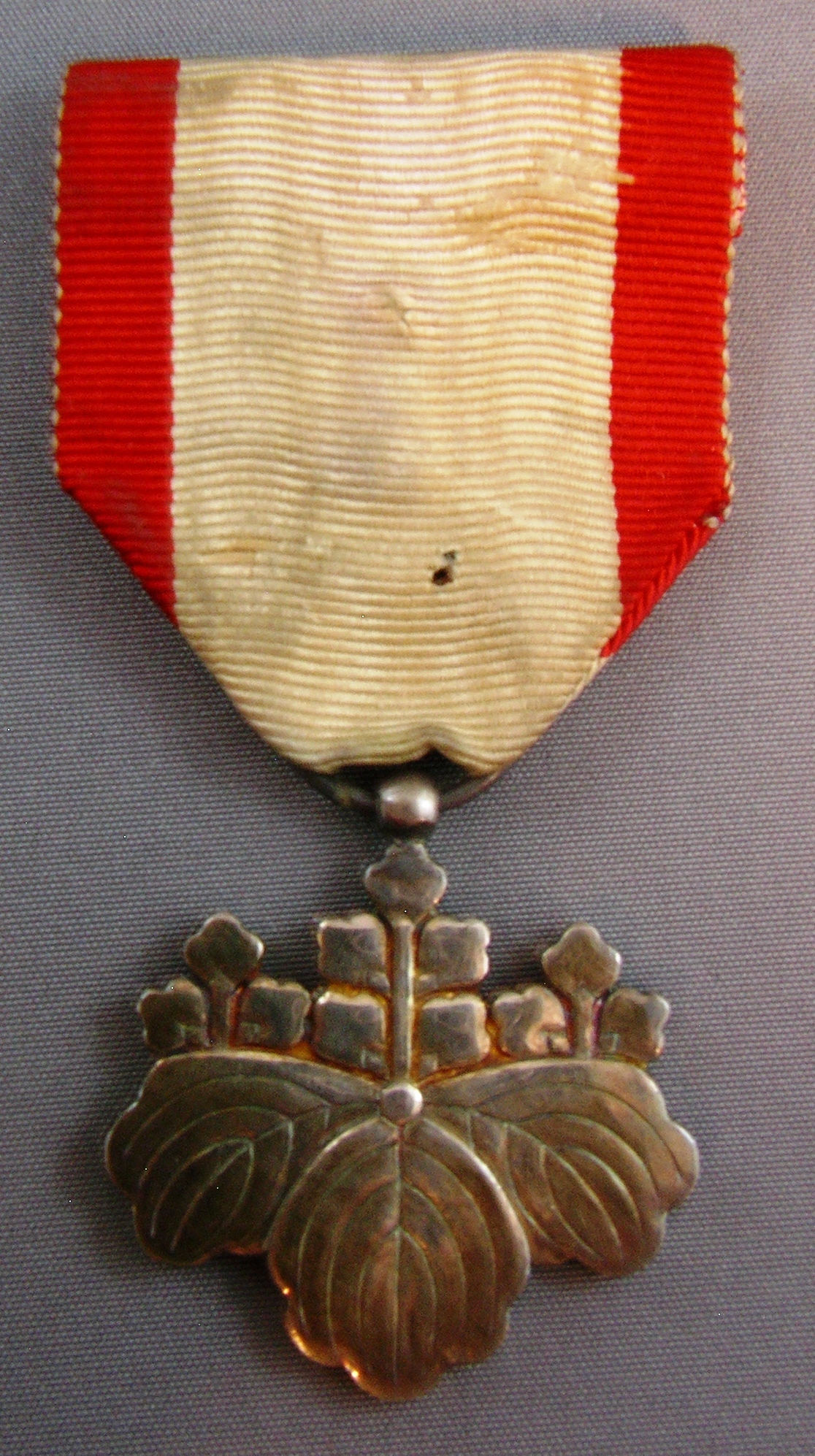In 1888 (Meiji 21) Order of the Sacred Treasure and the Order of the Sacred Crown were instituted (the later was awarded to women only). The 8th Class shown above was awarded to ordinary soldiers, and low-ranking officers. All classes of the Order of the Golden Kite were available only to the military. All classes of the Order of the Rising Sun were available to both military and civilian personnel (and some have been awarded to foreigners). The 8th Class Order of the Rising Sun (Order of the White Pawlonia Leaves) was awarded to both civilian and military personnel.