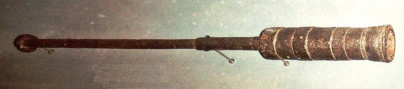 The Bâton à feu, or Baston à feu (French for “Fire stick”), is a type of hand cannon developed in the 14th century in Western Europe. This weapon type corresponds to the portable artillery of the second half of 14th century. The Bâton à feu at the Musée de l’Armée in Paris has an hexagonal cross-section, and looks like a steel tube. It weighs 1.04 kg, and has a length of 18 cm. Its caliber is 2 cm. In order to facilitate handling, the metal piece was placed at the end of a wooden pole. The powder was ignited through a small hole at the top, with a red-hot steel stick.