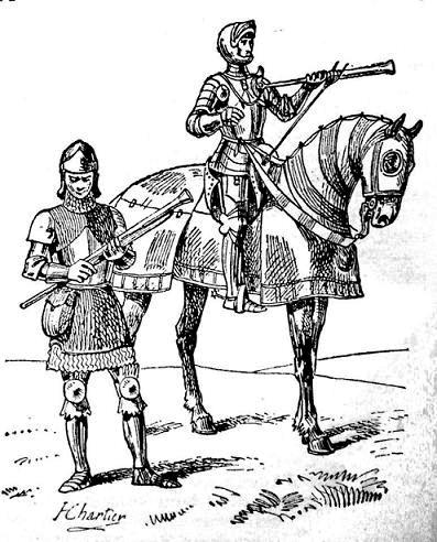 14th century drawing of a mounted culverinier armed with a hand cannon,.