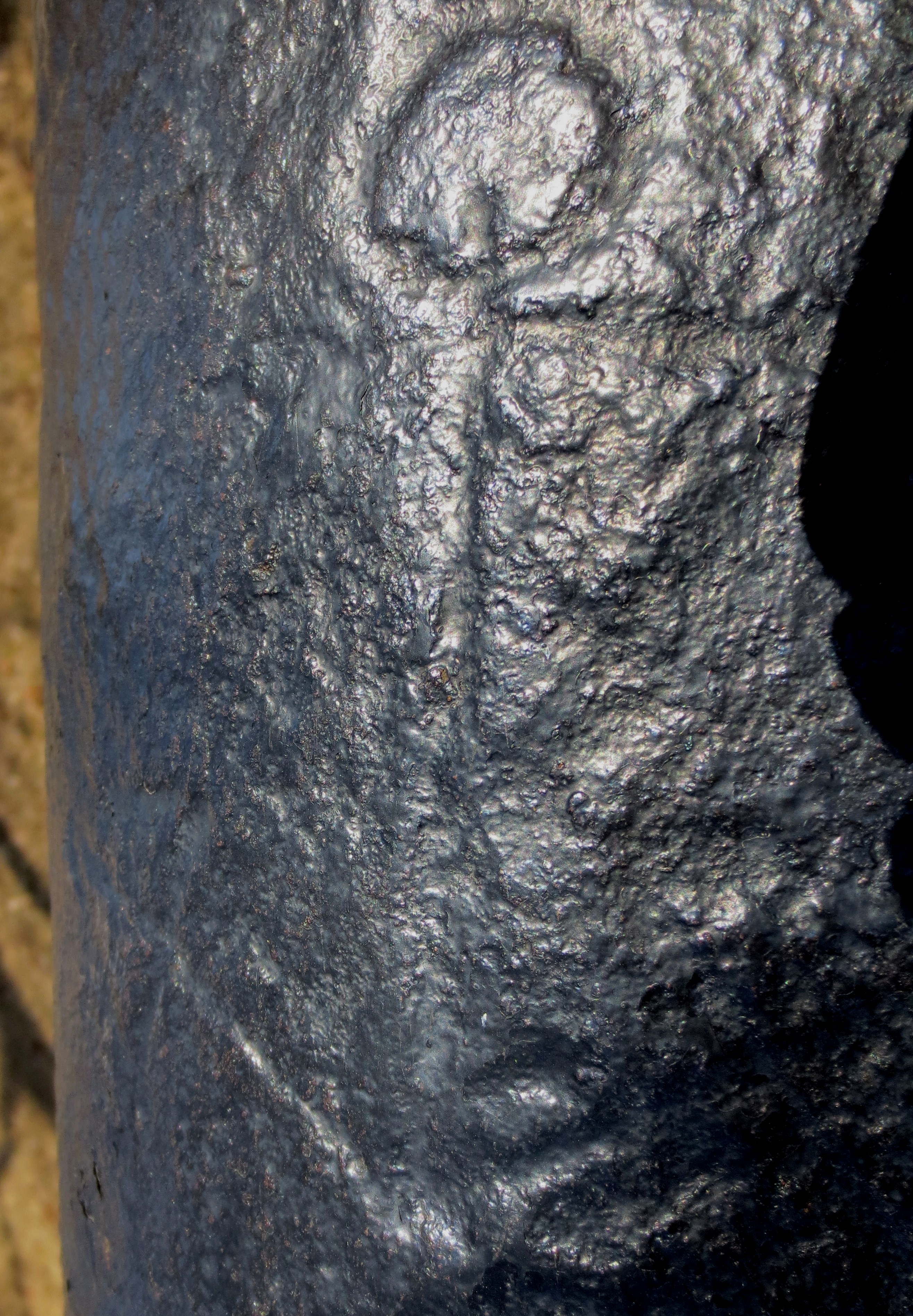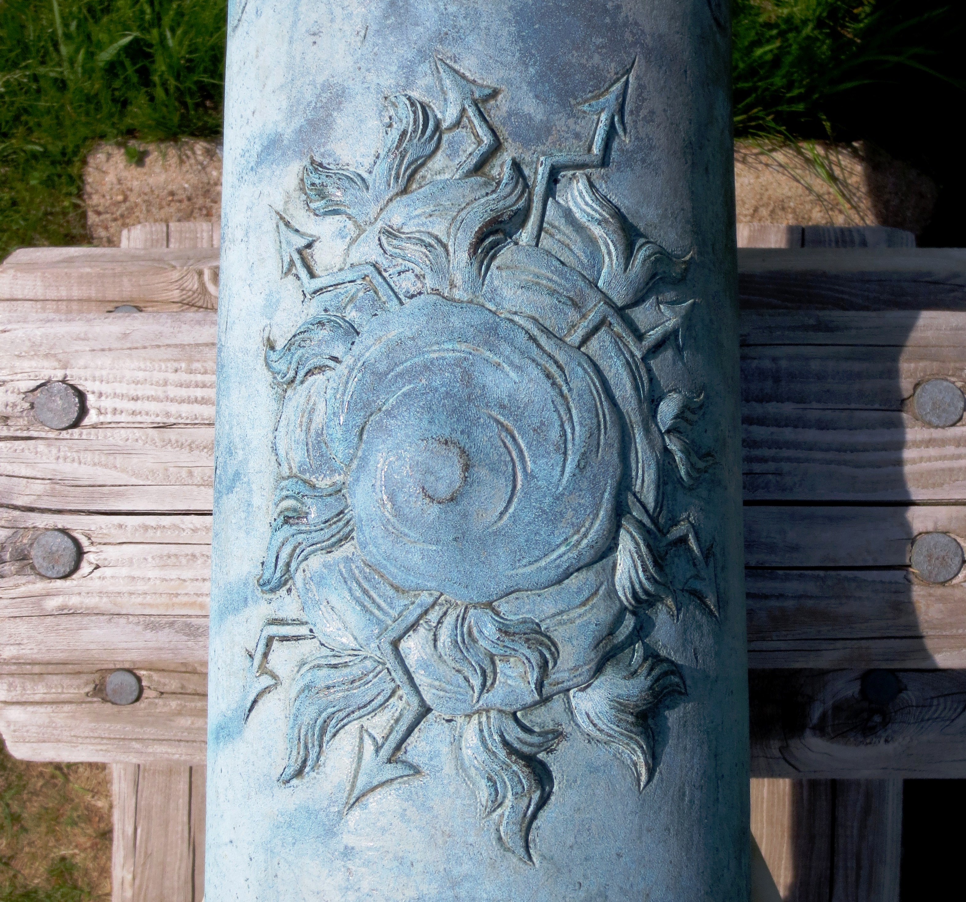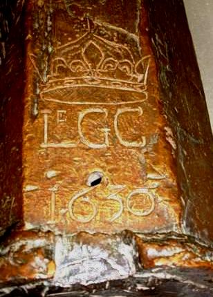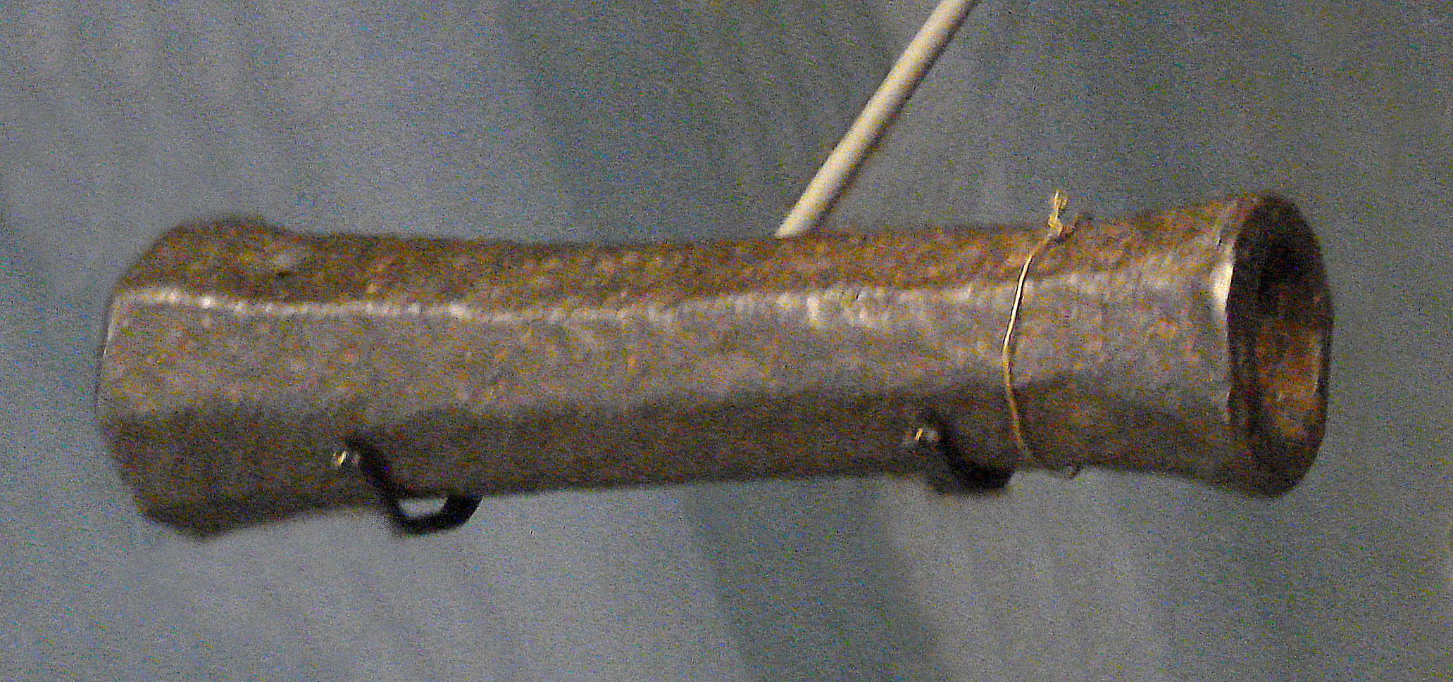 The Penetang Gun is believed to have been brought to New France from the old world as can be seen by the insignia on the breech. It is stamped 1630, LeGC with a crown. The initials stand for”Le Grand Condé” who served under Prince Louis II as Captain General of the French Army in the mid-17th century. The gun’s breech is made of Bronze which has been cast in a hexagonal shape. Its iron barrel is reinforced with iron hoops.[6] The chase and breech-ends of the cannon are of separate construction. The wrought iron construction of the chase is associated with guns of the late 15th and early 16th centuries. The octagonal section of the cast Bronze breech and the shape of the cascabel also indicate a date in the first half of the 16th century. To be operational it would have been strapped with iron bands or strong ropes onto a wooden bed, which could itself be mounted on a yoke or carriage.