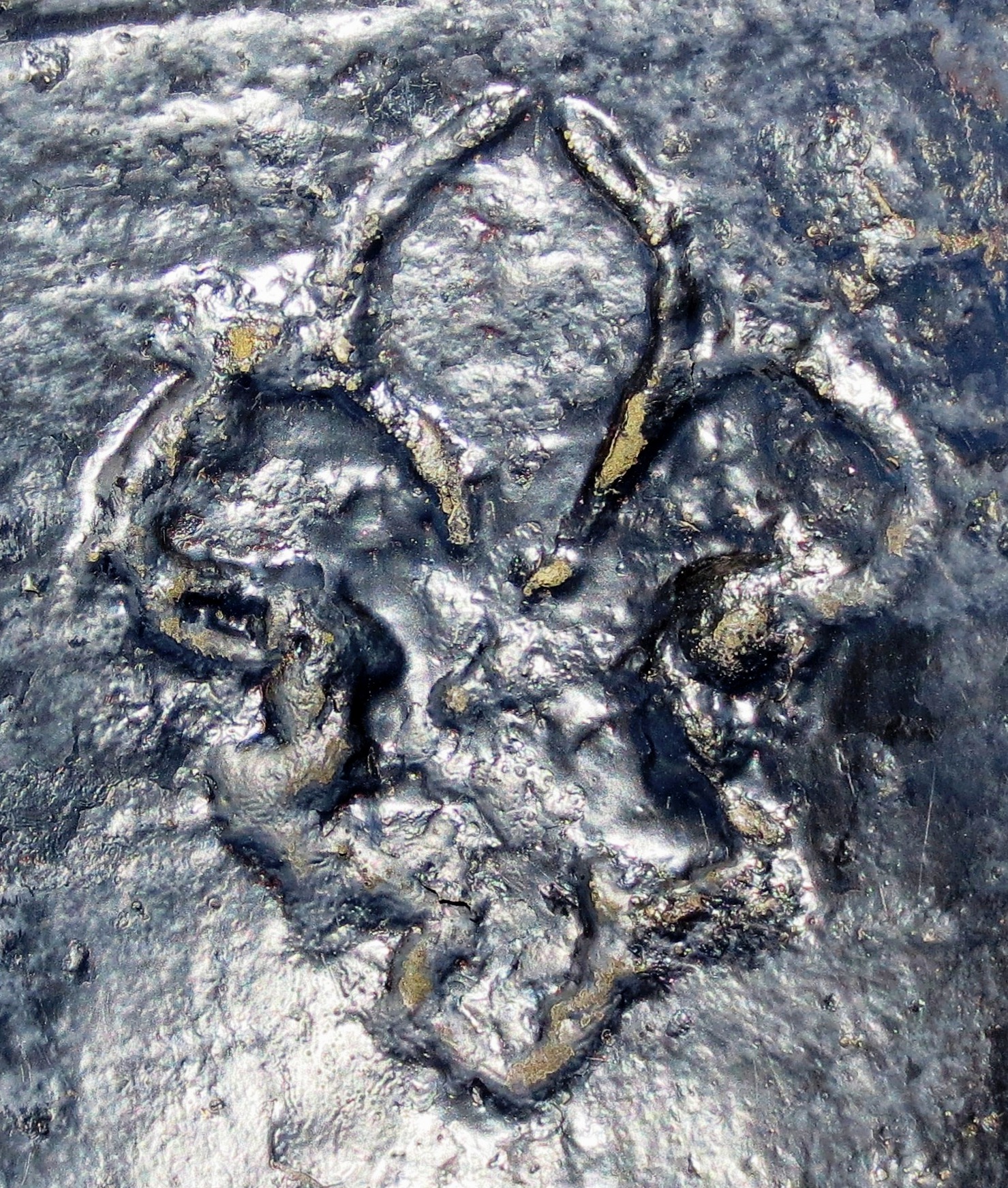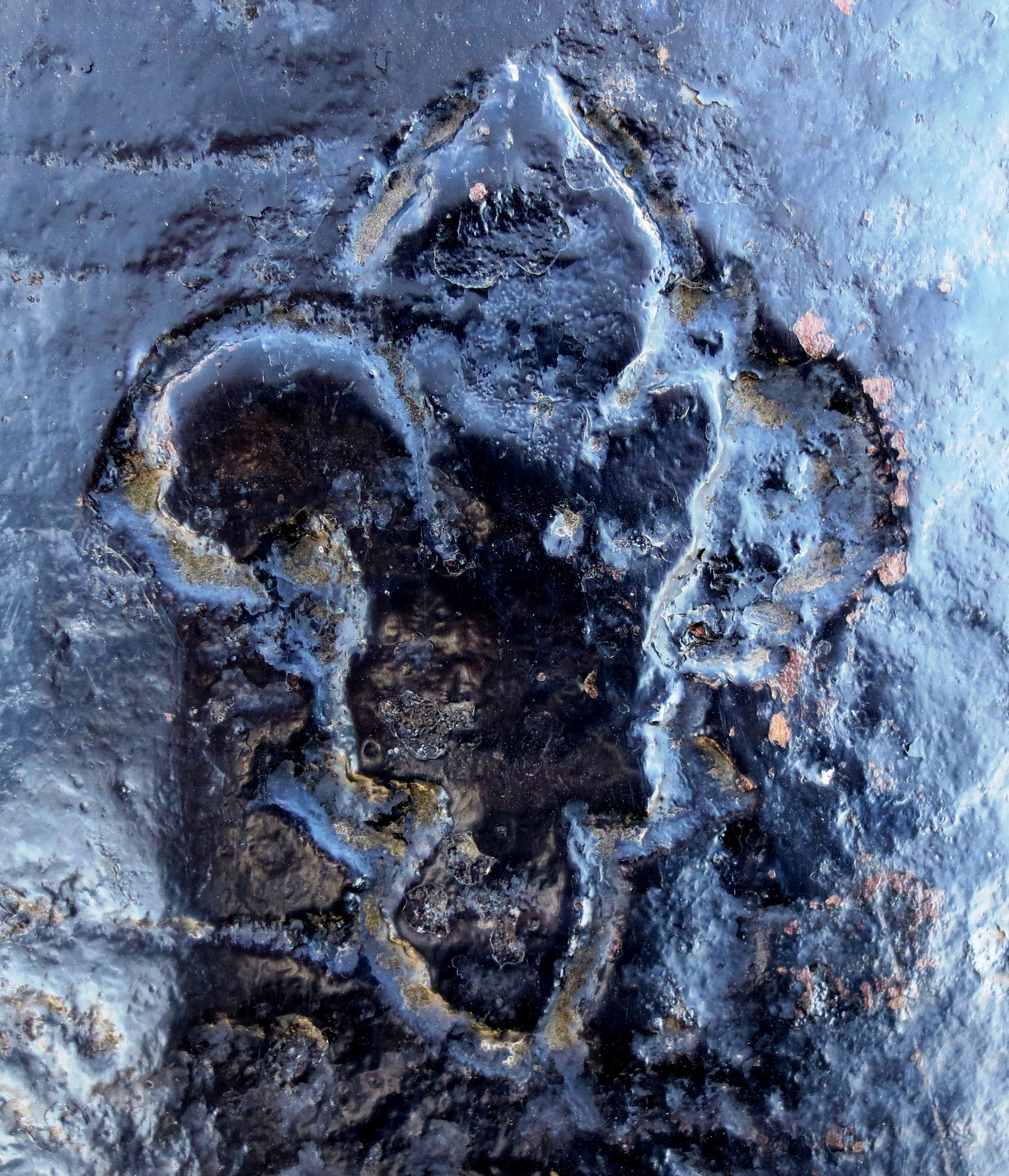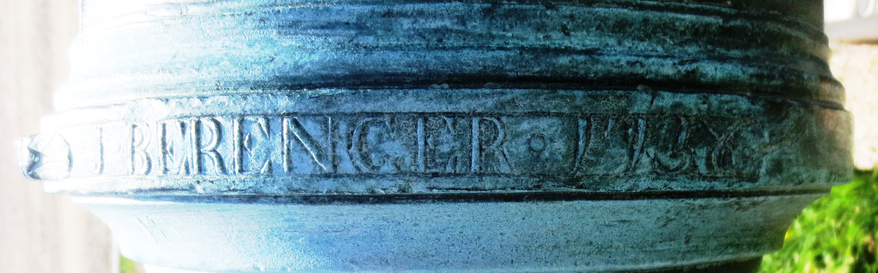 The Penetang Gun is believed to have been brought to New France from the old world as can be seen by the insignia on the breech. It is stamped 1630, LeGC with a crown. The initials stand for”Le Grand Condé” who served under Prince Louis II as Captain General of the French Army in the mid-17th century. The gun’s breech is made of Bronze which has been cast in a hexagonal shape. Its iron barrel is reinforced with iron hoops.[6] The chase and breech-ends of the cannon are of separate construction. The wrought iron construction of the chase is associated with guns of the late 15th and early 16th centuries. The octagonal section of the cast Bronze breech and the shape of the cascabel also indicate a date in the first half of the 16th century. To be operational it would have been strapped with iron bands or strong ropes onto a wooden bed, which could itself be mounted on a yoke or carriage.