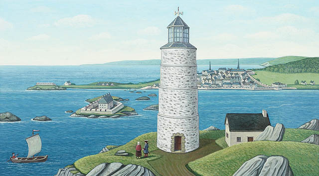 Louisbourg view of the harbour, painted by Dennis Noble.