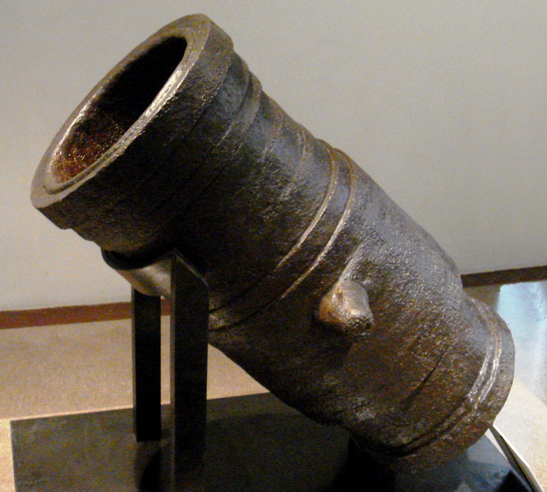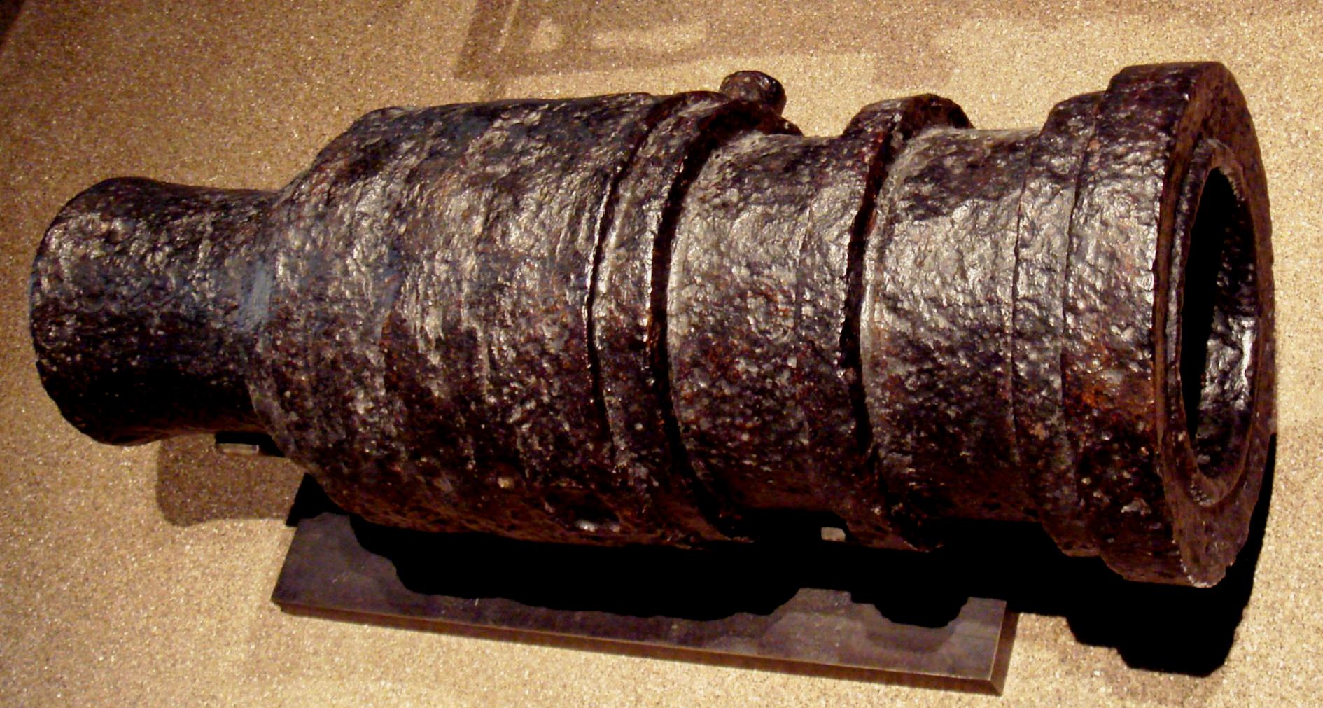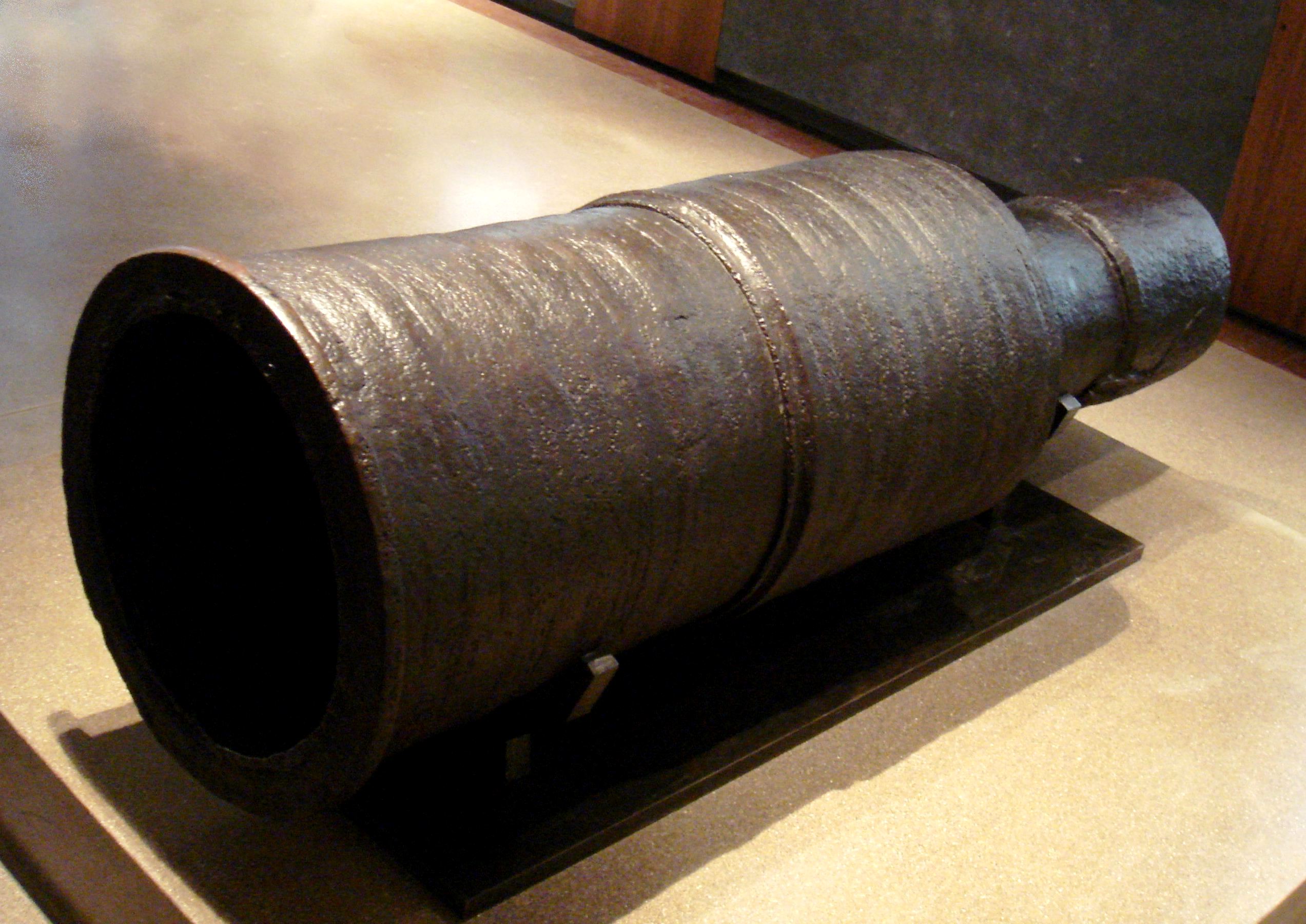 Wrought iron bombard, circa 1450, La Chapelle-aux-Naux, near Langeais. Length: 2 m, calibre: 486 mm, weight: 1,500 kg, ammunition: 130 kg stone ball, range: 100-200 m.