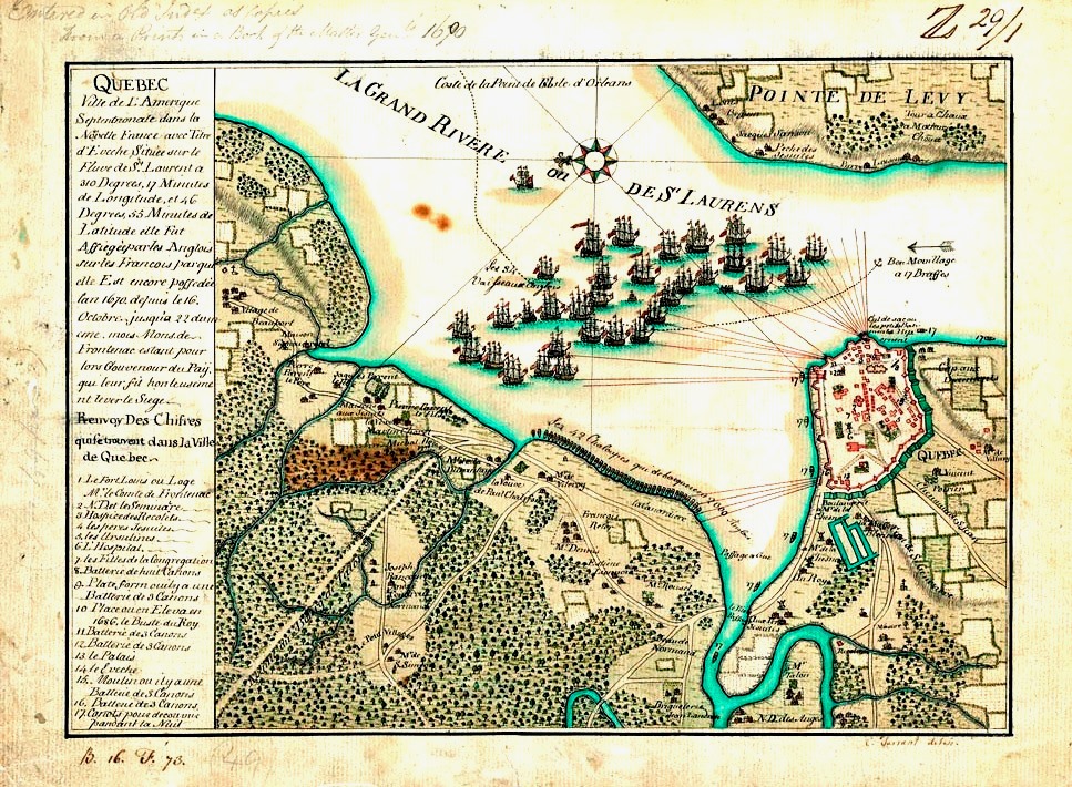 Part of Québec‘s defences were formidable for the time and when Frontenac had his gunners fire on the invaders’ ships, the upper town was protected by a good wall with intermittent batteries and more defensive works up near the Chateau Saint-Louis near Cape Diamond. In the lower town, there were two strong French shore batteries armed with heavy 18 and 24-pounder Naval cannons along the city’s harbour.[9] On the landward side, a line of earthworks punctuated with 11 redoubts enclosed the city from the western side. Frontenac had about 3,000 soldiers including three battalions of Colonial Regulars. As well, his gun batteries effectively covered the water approaches to Québec City, and as a result of their vigorous defence they successfully fought off Phips forces.[10]