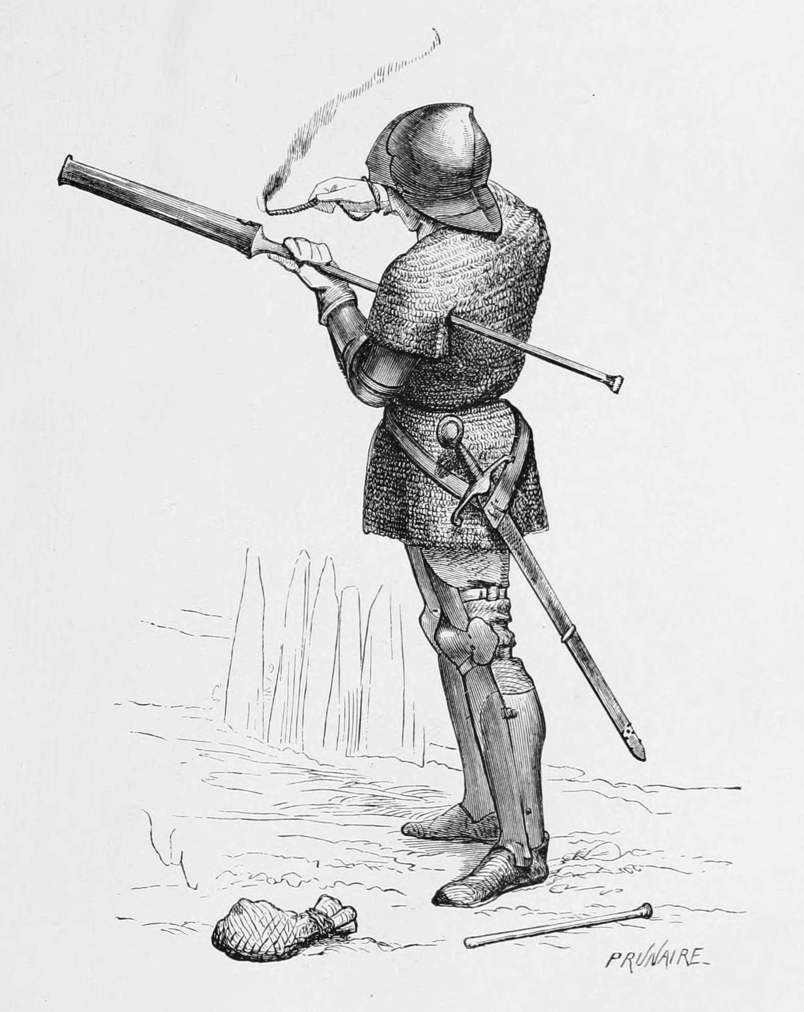 Swiss soldier firing a small hand-cannon, with his poweder bag and ramrod at his feet, late 14th century.