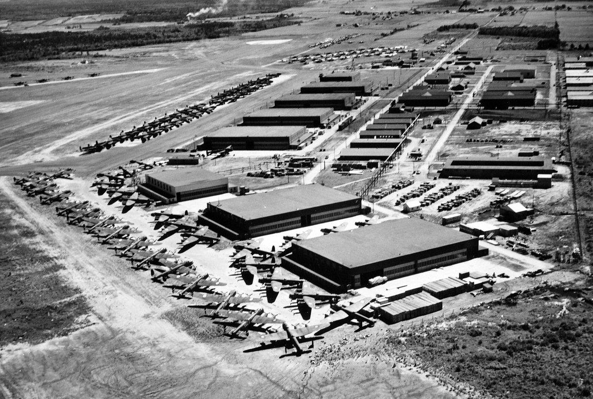 Avro Lancasters at RCAF Air Station Scoudouc, New Brunswick.  The photo was taken after VE Day (8 May 1945), but before VJ Day (15 Aug 1945).  There are at least 70 Lancasters in this photo, all likely part of “Tiger Force” preparing to deploy to Japan.  No. 4 Repair Depot, established in September 1941 was located here.