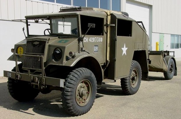 Canadian Military Pattern Chevrolet CGT Field Artillery Tractor (FAT), (4×4, 101-inch wheelbase) with Limber. LdSH secure compound, Historical vehicle Troop.