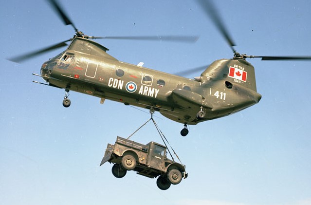 M37 Dodge 3/4-ton Truck being lifted by a Boeing Vertol CH-113A Voyageur Helicopter (Serial No. 10411), c1965.