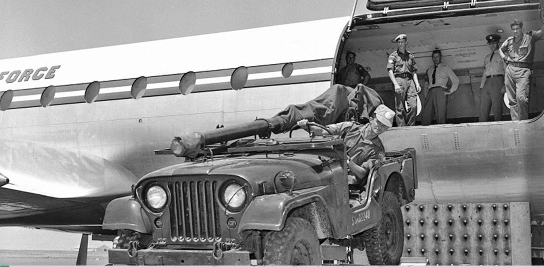 106-mm M40A1 Recoilless Rifle mounted on an M38A1 CDN3 Jeep, being unloaded from a transport aircraft in Cyprus in 1964.