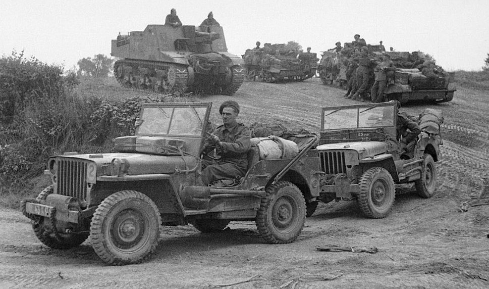 U.S. made jeeps leading a column with carriers and a Sexton 25-pdr self-propelled gun, moving forward, south of Caen, 1 August 1944.