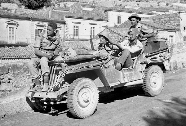 Canadian war correspondents in a jeep, Modica, Italy, 13 July 1943.
