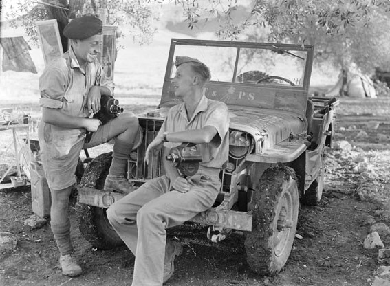 Canadian war correspondents with film cameras and a jeep in Sicily, 1943.