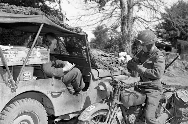 Lance-Corporal Bill Weston (left in jeep) receives a message from despatch rider Sapper Arnot Walter, both men with the 6th Field Company, Royal Canadian Engineers (RCE), France, 2 July 1944.