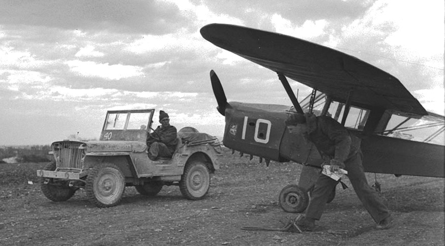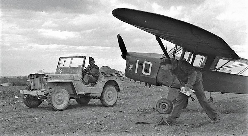 Captain N.H. Chase returning from artillery observation flight in his Taylorcraft Auster AOP Mk. III aircraft of the RAF, supporting the 17th Field Regiment, RCA at Castel Frentano, Italy, 10 Feb 1944.