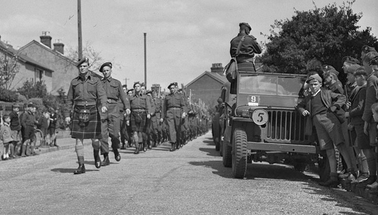 The Irish Regiment of Canada passes the saluting base during Gen. H.D.G. Crerar’s review at Eelde airport, Netherlands, 23 May 1945.