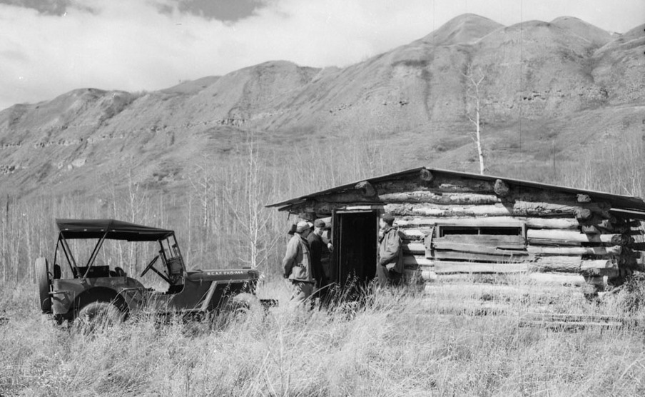RCAF Jeep and crew at a log cabin, Beaton River Canyon, British Columbia, June 1950.
