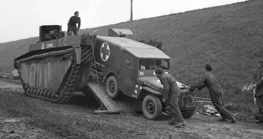 North Shore (New Brunswick) Regiment jeep ambulance being loaded onto an amphibious Buffalo AFV as the 8th Brigade embarks for a bridgehead, 11 Oct 1944.