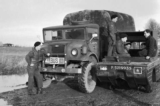 The official caption states these are personnel of the 2nd 7th Reconnaissance Regiment (17th Duke of York’s Royal Canadian Hussars) transfering from a “Seep” (amphibious jeep) to a Chevrolet C60S truck serving as the unit bus at Weener, Germany on 13 Feb 1946.