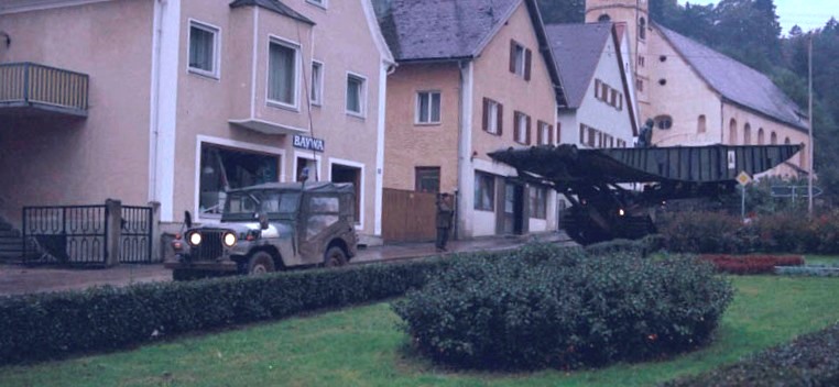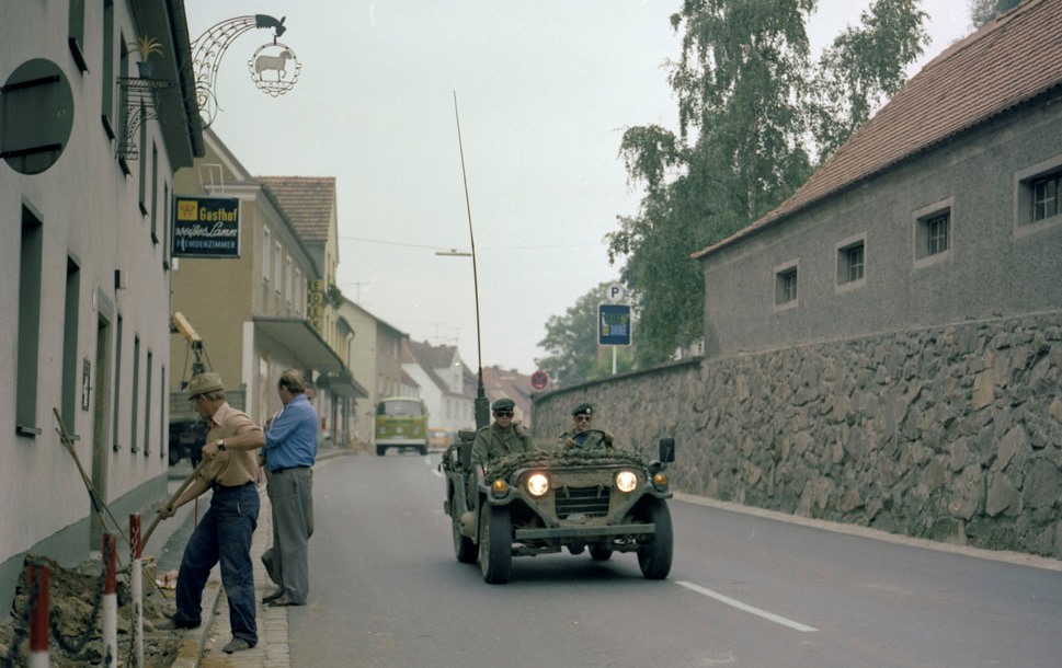 4 CMBG Jeep driving through a town in Germany, Fallex, Sep 1977.