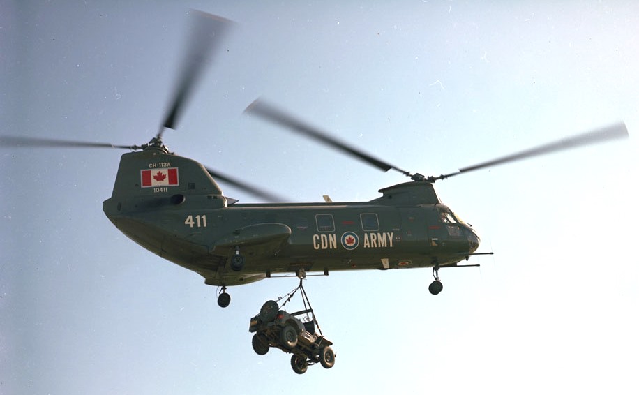 Boeing Vertol CH-113A Voyageur (Serial No. 10411), airlifting a jeep.