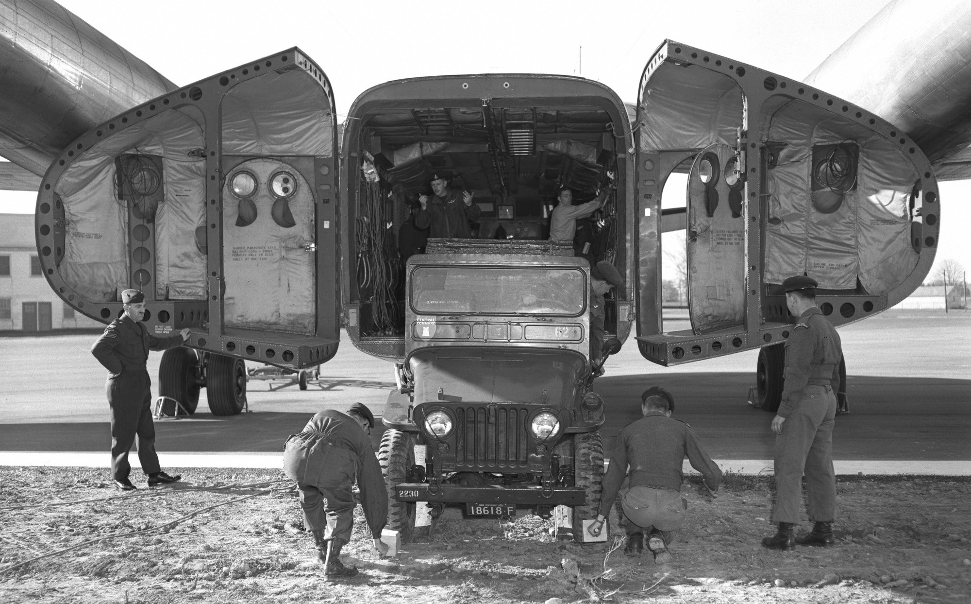Fairchild C-119 Flying Boxcar, clamshell cargo doors open to unload a Canadian Army Willys jeep.