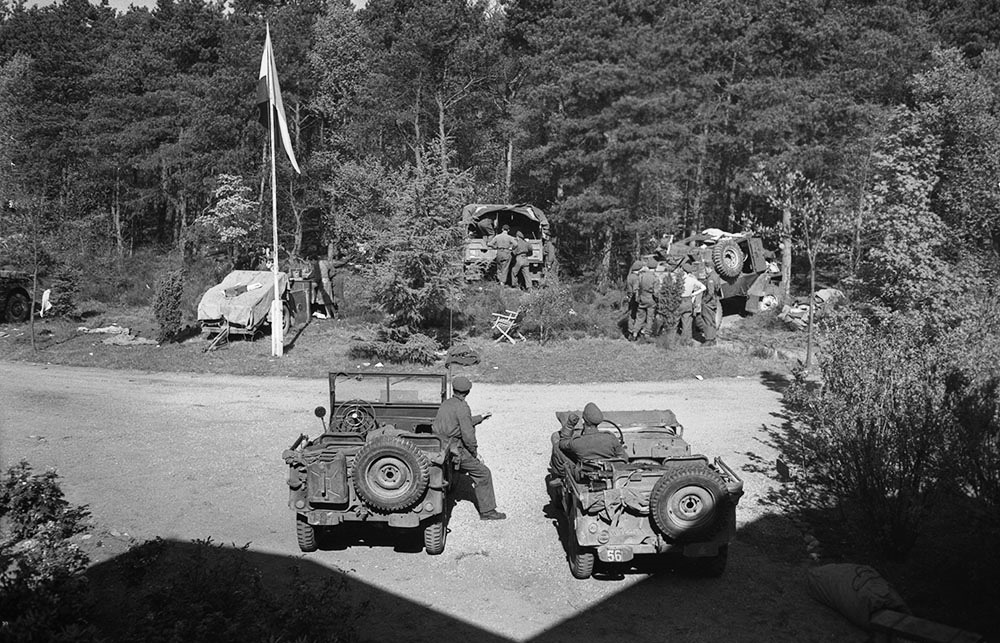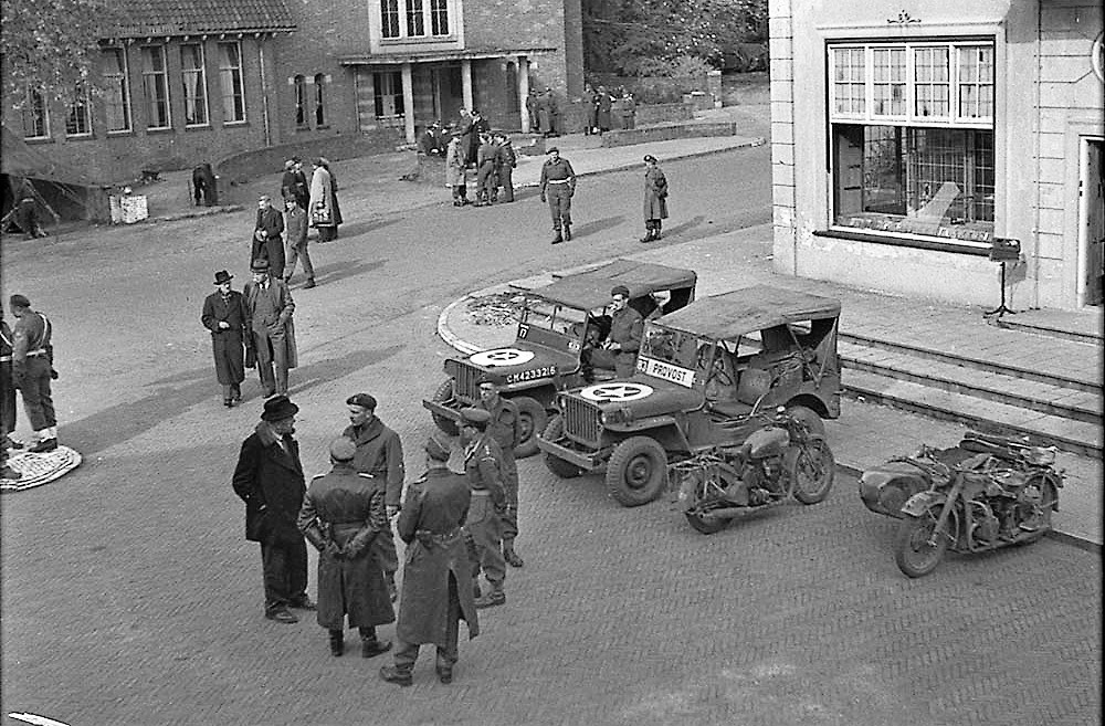 Canadian Provost Corps jeeps with various Allied officers, German officers, and Dutch civilians in the square at the time of discussion of food distribution to the Dutch population 2 May 1945.