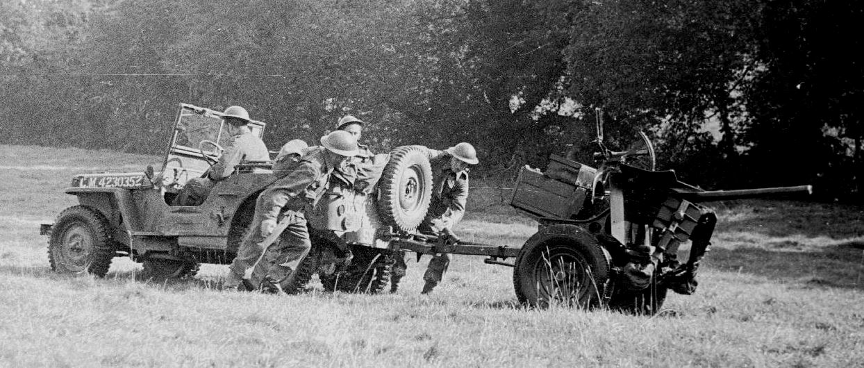 Jeep towing a 2-pounder AT gun in the UK, ca 1942.