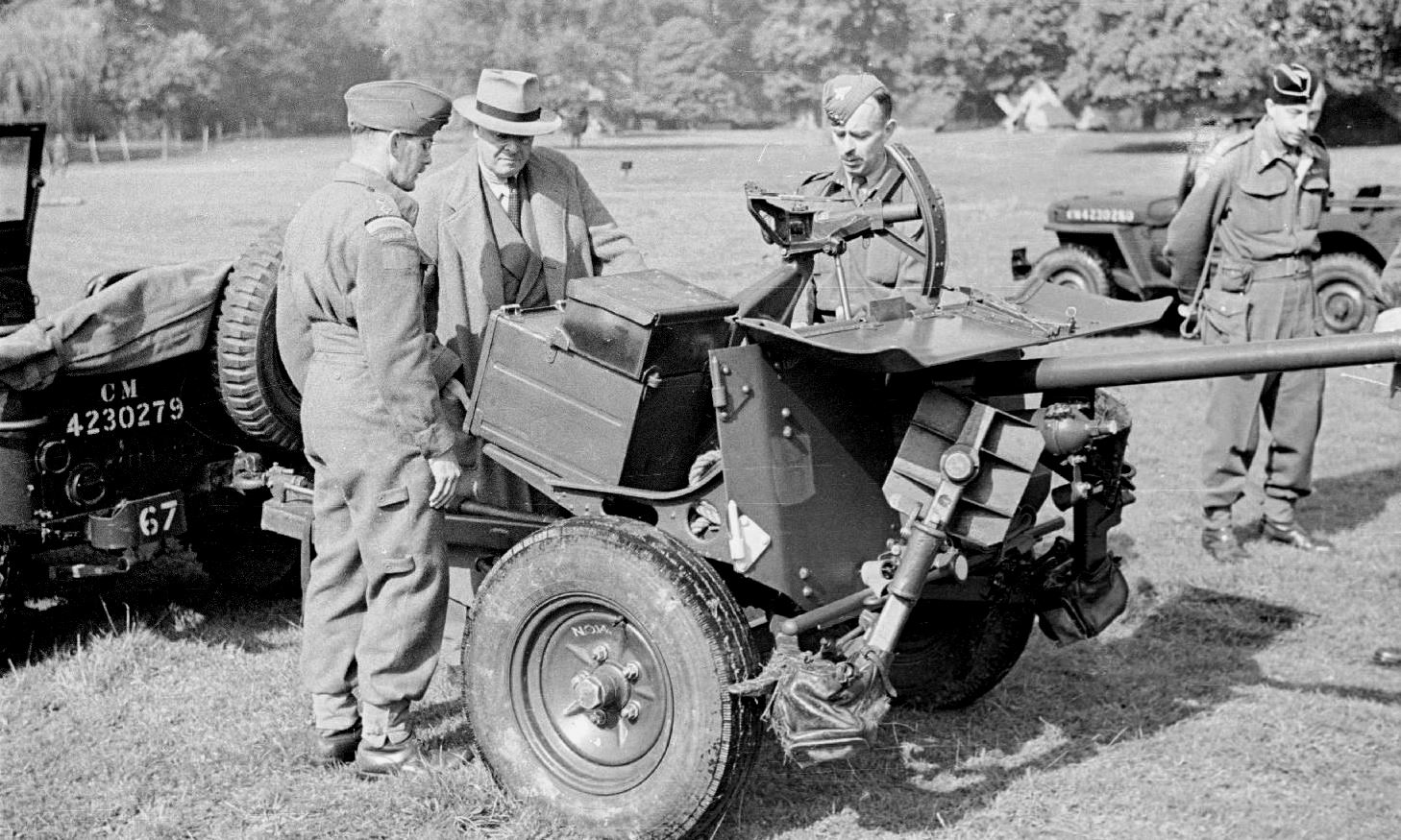 Canadian solders training in the UK, ca 1940, with a 2-pounder AT gun towed by a jeep in the UK.