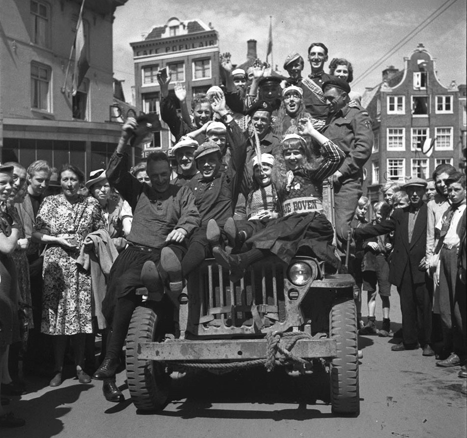 Dutch civilians celebrate Liberation by crowding on jeep of 1st Canadian Corps.  Sgt Doug Skene and Tpr Frank Grummett are somewhere in the jeep, 10 May 1945.