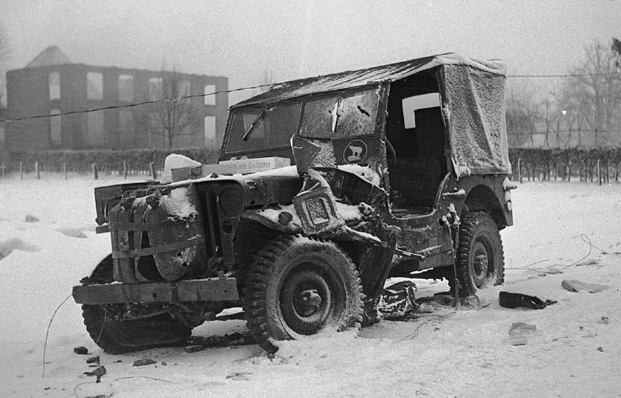 Canadian Army jeep struck by enemy fire on the road leading to Zettin, Netherlands, 20 Jan 1945.