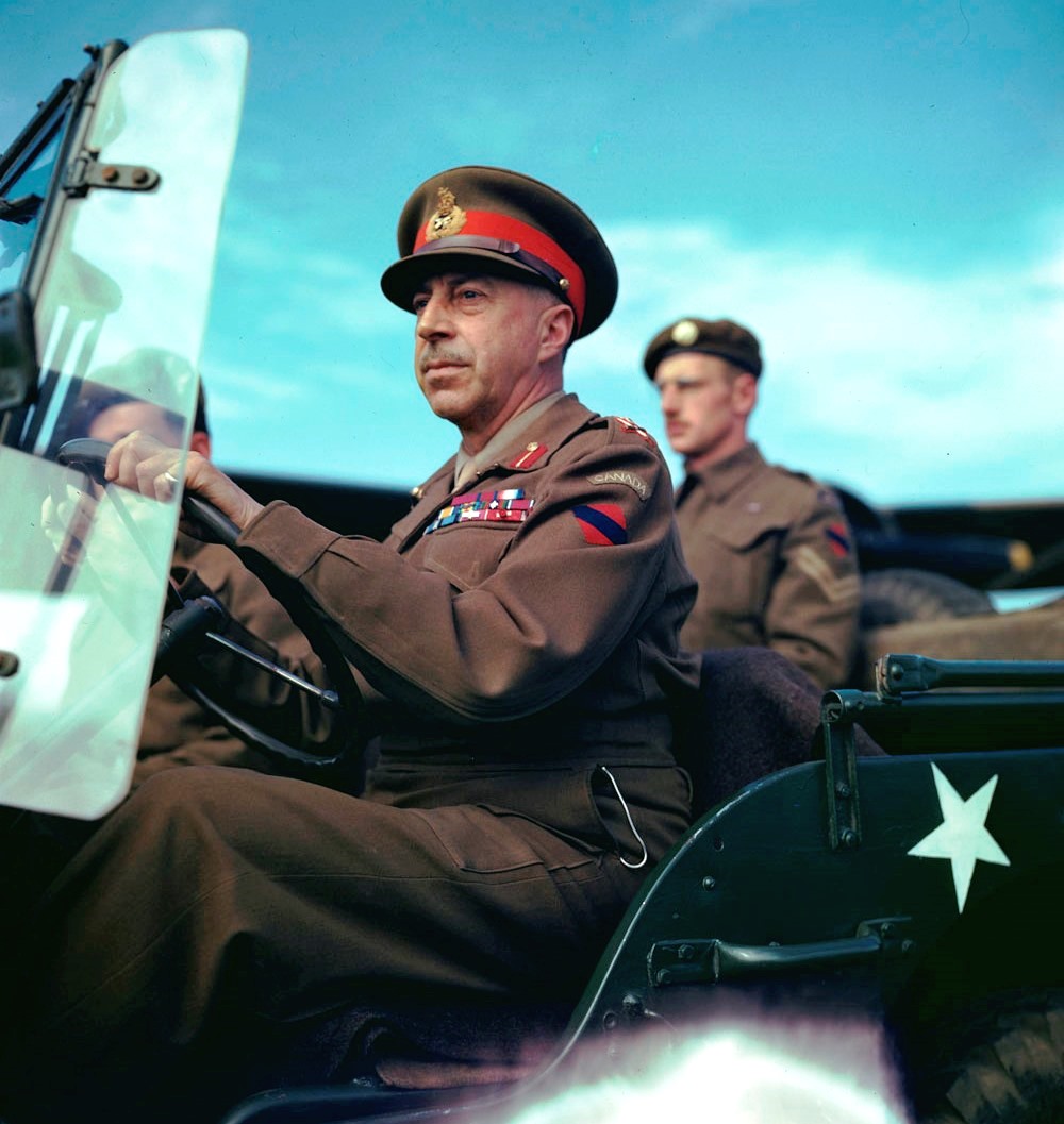 Corps Commander Gen. H.D.G. Crerar at the wheel of jeep accompanied by Brig. Cunningham and Brigade Major N. Kingsmill, 19 June 1944.