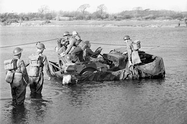 Personnel of the 2nd Anti-Tank Regiment, RCA, using waterproofed jeep during river-crossing exercise, Bognor, England, 14 Dec 1942.