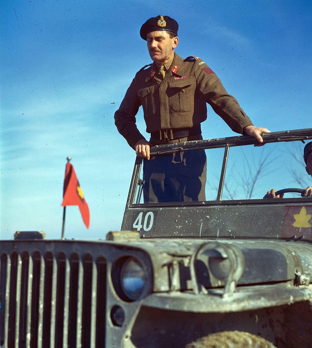 MGen E.L.M. Burns with his jeep, during a visit to the Royal Canadain Dragoons, in Italy, 20 Mar 1944.