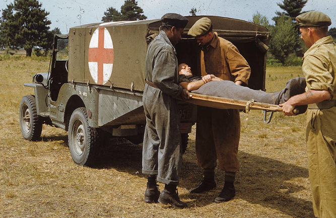 Ambulance jeep with Rifleman Bill Benson in Normandy, 10 July 1944.