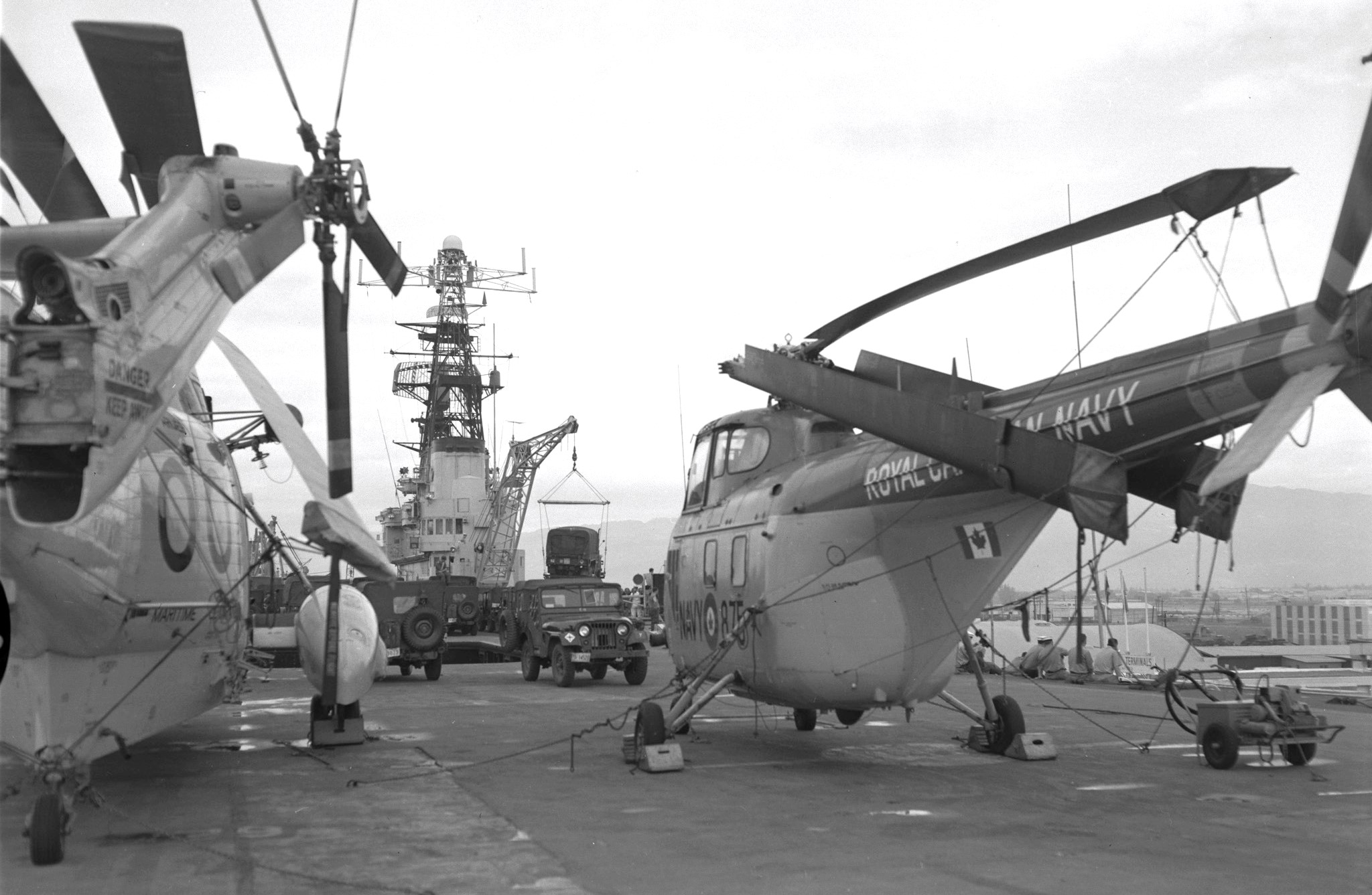 Jeep on the flight deck of HMCS Bonaventure as the Naval helicopters “co-mingle” with Army equipment. This movement of Army equipment from Norway to Canada was one of the Bonaventure’s last missions before it was decommissioned on 3 Jul 1970.