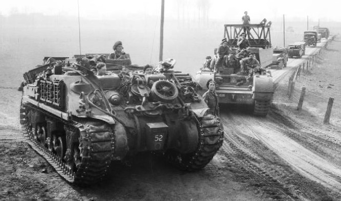A Sherman ARV and other specialised armour moving up to cross the Rhine, 24 March 1945.