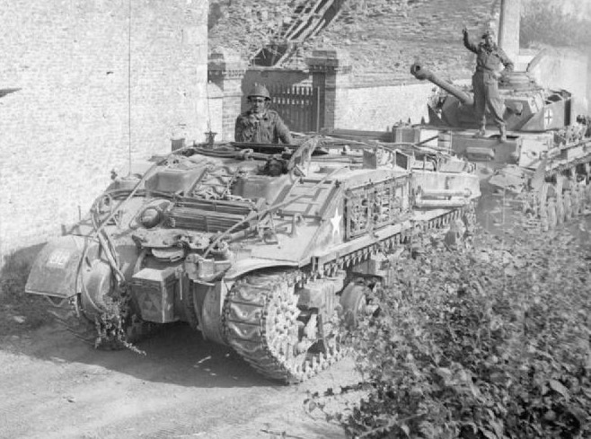 Sherman III ARV I – British Armoured Recovery Vehicle conversion of Sherman III (M4A2), REME, 79th Armoured Division, Summer 1944. Note large winch pulley on front glacis plate and specialized storage on hull sides.
