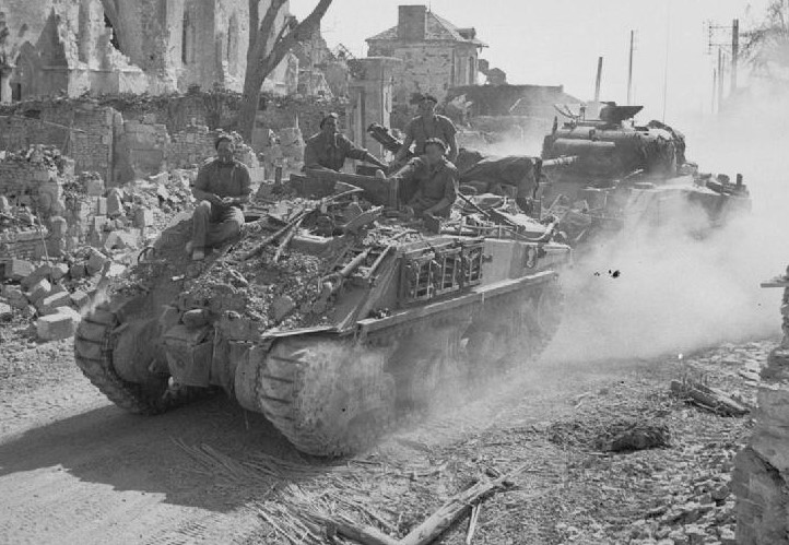 A Sherman Recovery tank towing a crippled Sherman through the ruined town of Bourguébus, five miles south of Caen on the road to Falaise, after it was cleared of the enemy by British infantry and tanks, 1944.