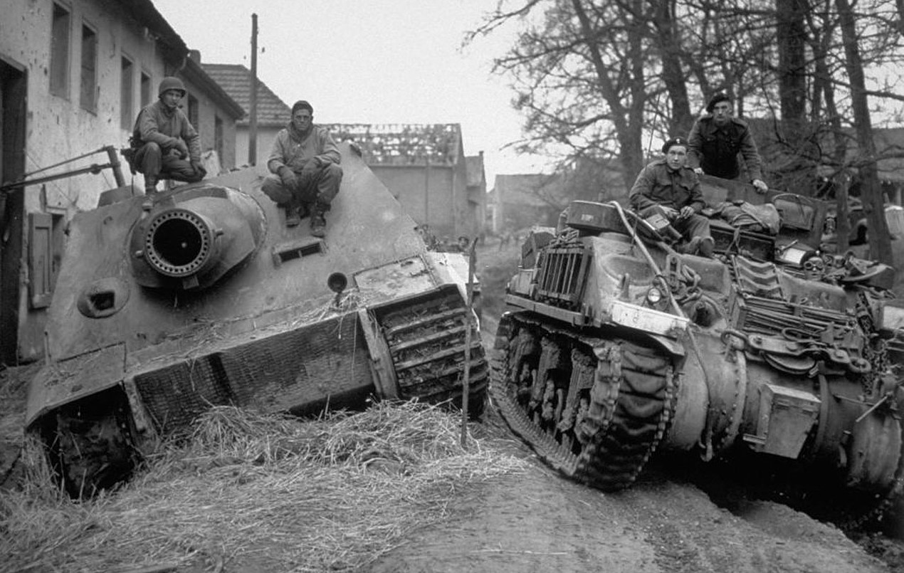 British ARV on a Sherman M4 chassis passing a German Sturmtiger, abandoned after a breakdown and captured by US troops, 28 February 1945.
