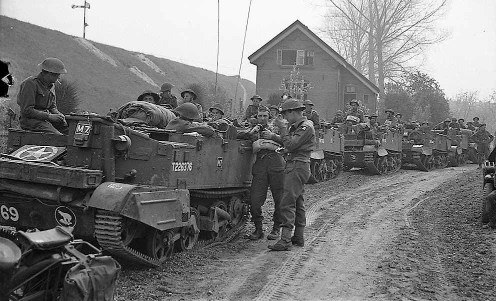 Essex Scottish Regiment in Universal Carriers, ready for loading onto Buffalo amphibious vehicles, 13 April 1945.