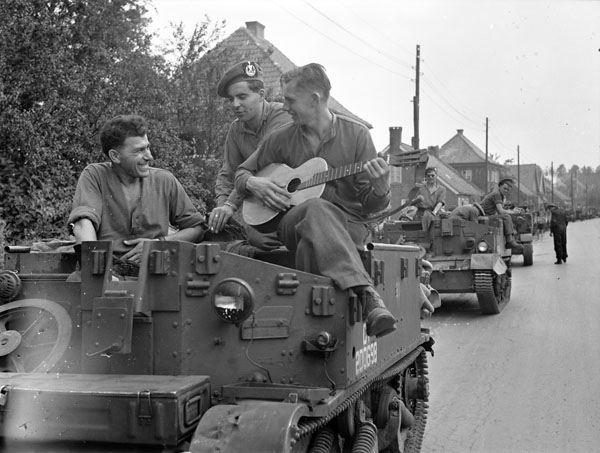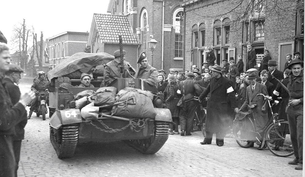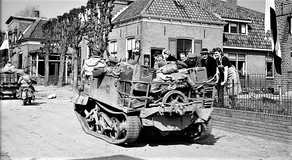 Dutch civilians on a WASP of 7th Reconnaissance Regiment (17th Duke of York’s Royal Canadian Hussars), 3rd Canadian Infantry Division, celebrating the liberation of Zwolle, Netherlands, 14 April 1945.